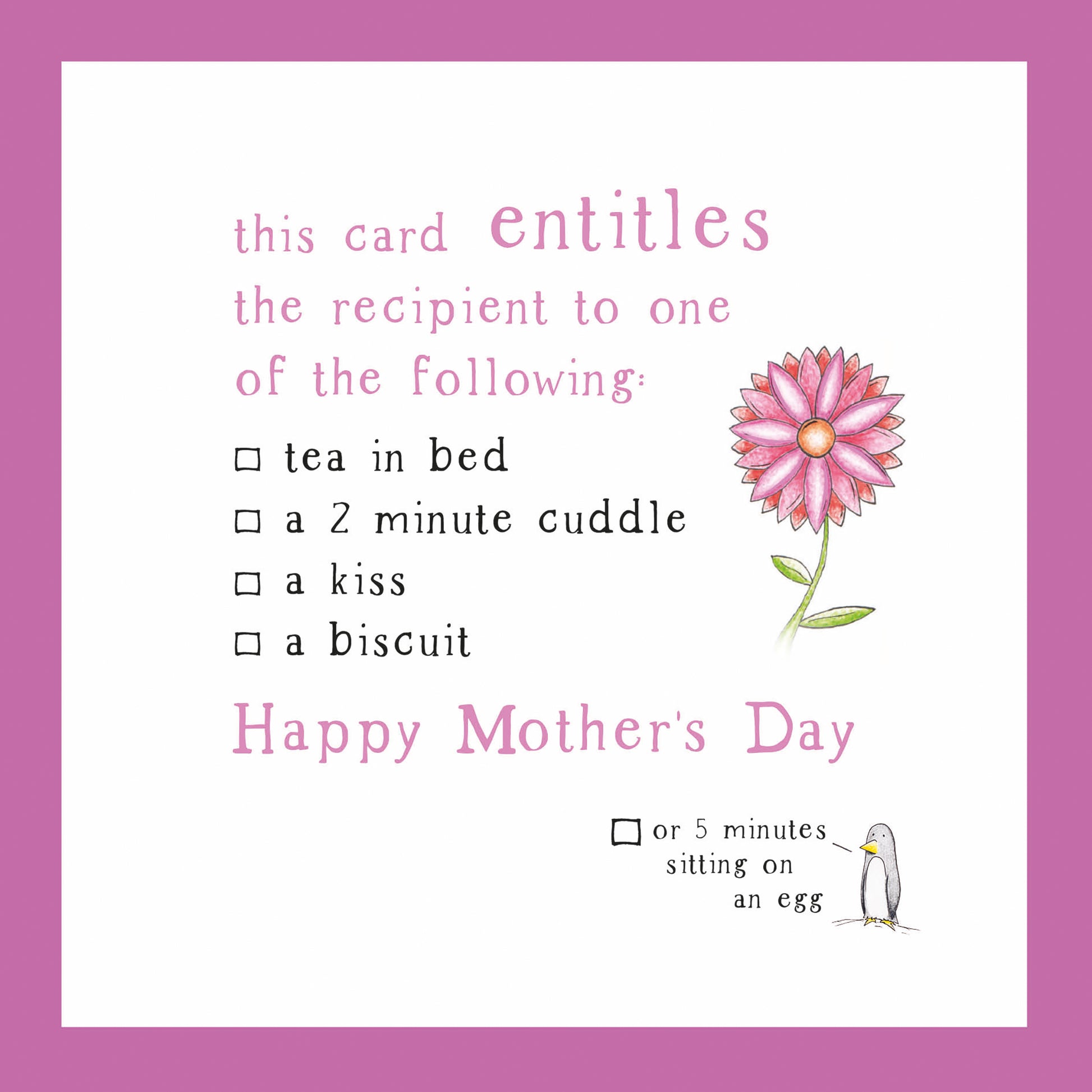 - Message On Front: this card entitles the recipient to one of the following: tea in bed a 2 minute cuddle a kiss a biscuit Happy Mother's Day or 5 minutes sitting on an egg