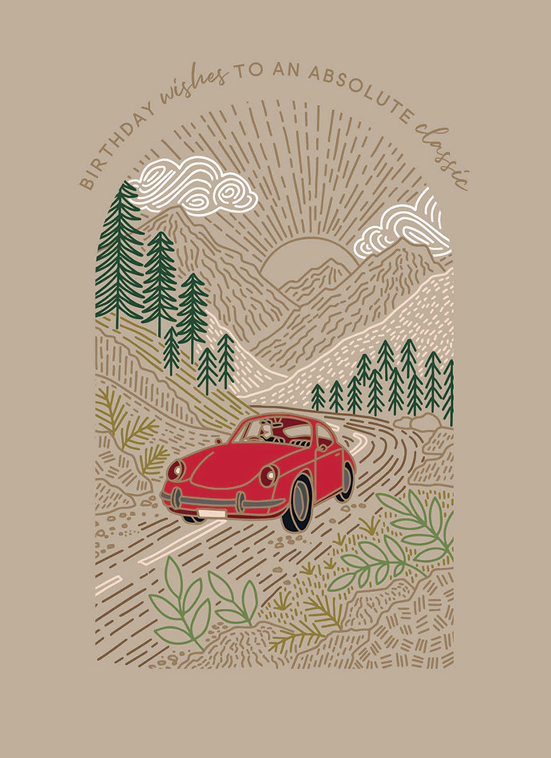 Celebrate a true original with this retro-inspired birthday card from Claire Wilson's distinctive nine-card collection. Featuring a vintage red sports car winding through a scenic mountain pass under a rising sun, this bold design delivers the message: 'Birthday wishes to an absolute classic.'
