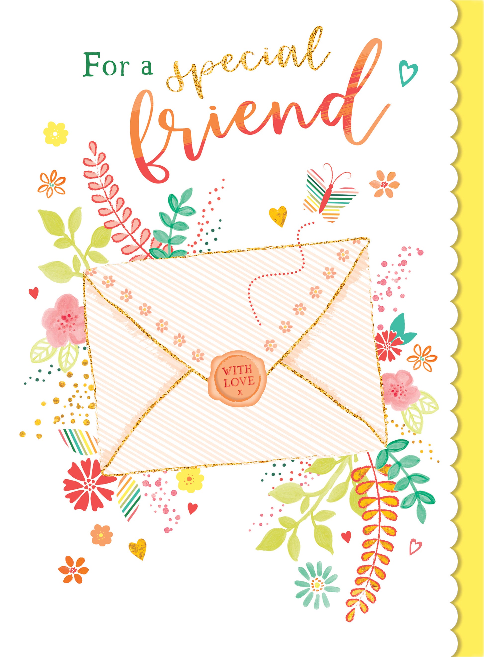 A beautifully designed greeting card featuring a sealed envelope with surrounding flowers.