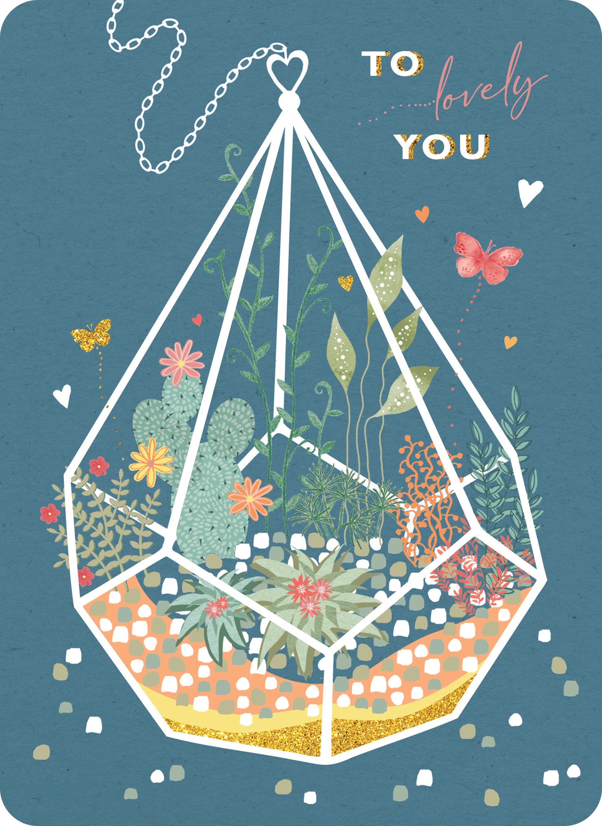 A beautifully designed birthday card featuring a terrarium filled with plants.