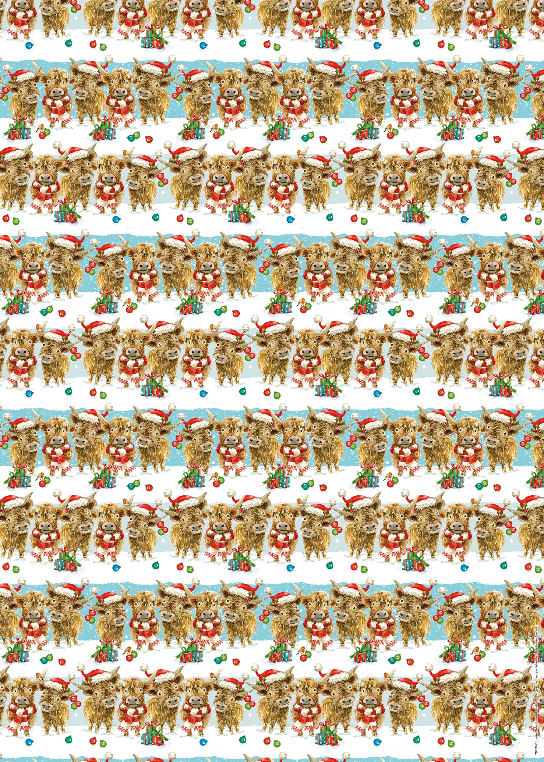 - Design: Highland cow, Santa Hat, Scarf, Snow, Bauble